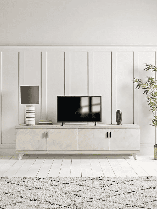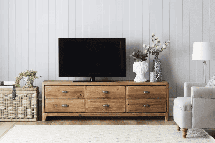 - مقاس التلفزيون: يُفضل أن تكون الطاولة أوسع من شاشة التلفزيون ببضعة سنتيمترات، حتى تمنحه ثباتًا وتوازنًا بصريًا. فعلى سبيل المثال، إذا كان التلفزيون بحجم 55 بوصة، فيُستحسن أن يكون عرض الطاولة لا يقل عن 140 سم.