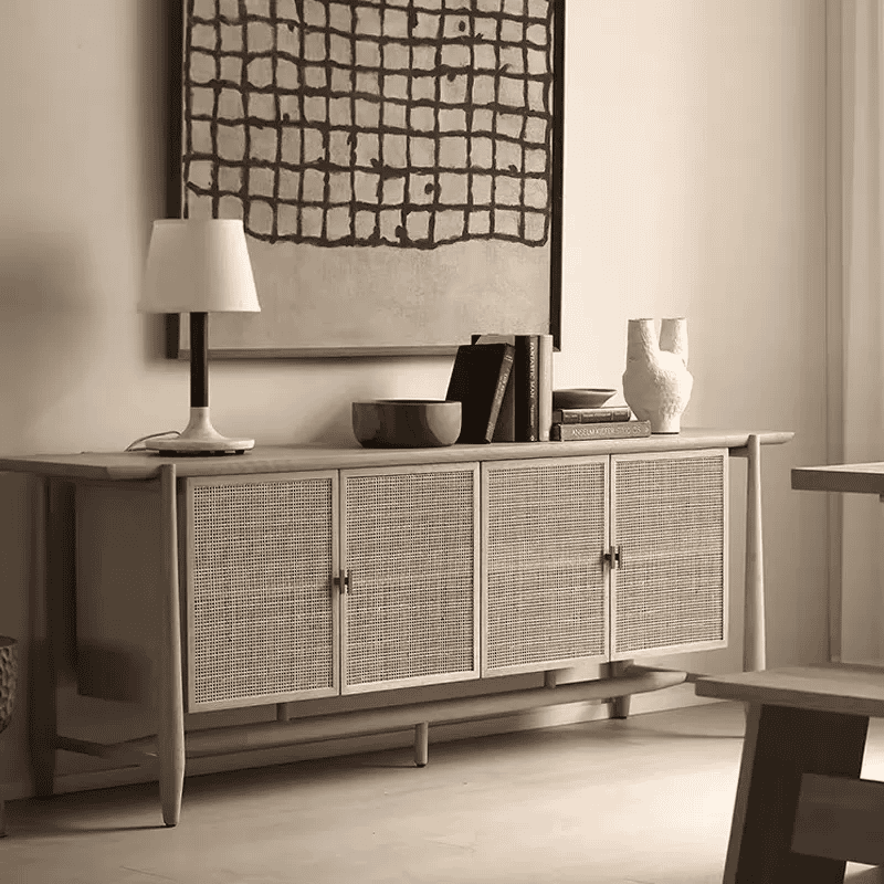 - الخامة: خشب طبيعي مع واجهات من الراتان اليدوي