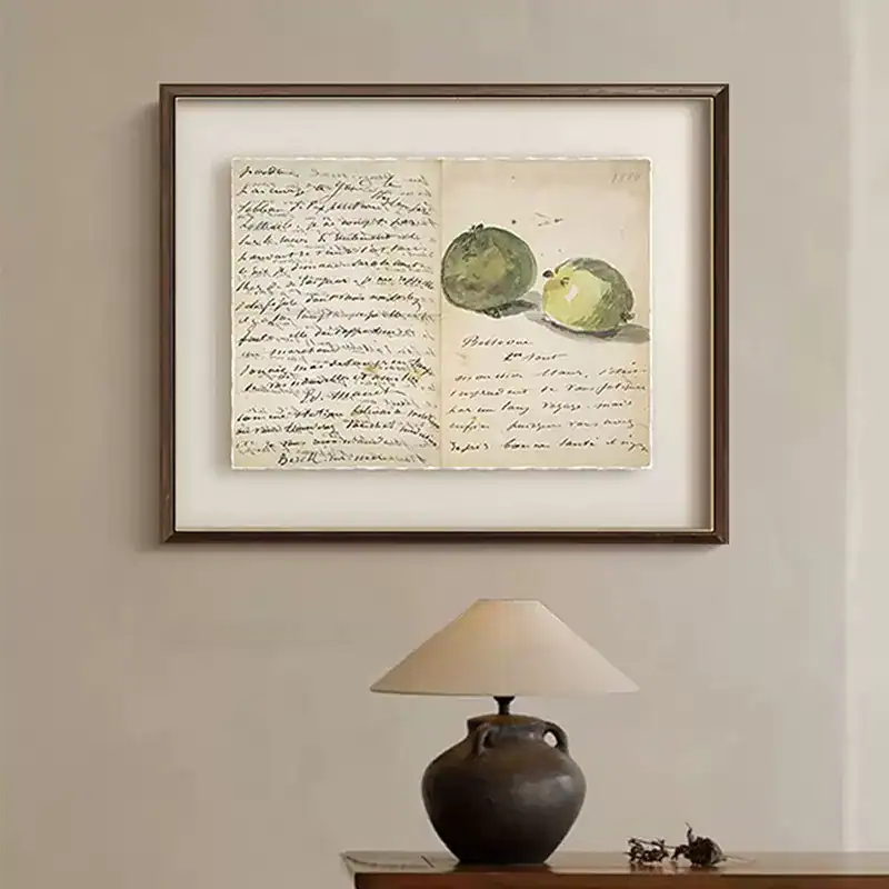 استمتع بإضافة لمسة فنية ناعمة إلى جدران منزلك مع إطار حائط خشب يحمل طابع الرسائل القديمة والرسومات النباتية الهادئة. هذا التصميم مستوحى من الطراز الأوروبي الكلاسيكي، ويجمع بين بساطة الإطار الخشبي وأناقة المحتوى الفني داخل البرواز، ليكوّن قطعة ديكور فريدة تناسب مختلف المساحات.