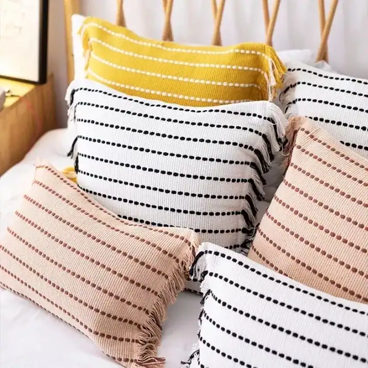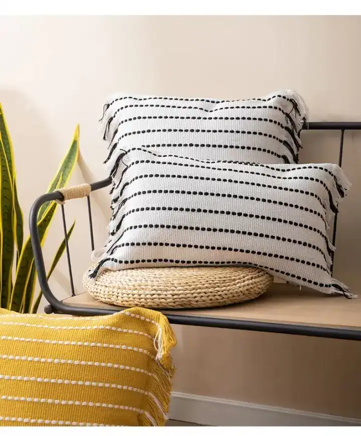جدد طابع غرفة المعيشة أو غرفة النوم مع مخدة كنب مخططة بتصميم أنيق وألوان دافئة تلائم جميع أنماط الديكور. تجمع هذه المخدات بين البساطة والنعومة، وتتوفر بتدرجات مثل الأبيض مع الأسود، الوردي، والأصفر، مما يتيح لك تنسيقها بسهولة للحصول على مظهر متوازن ومريح.