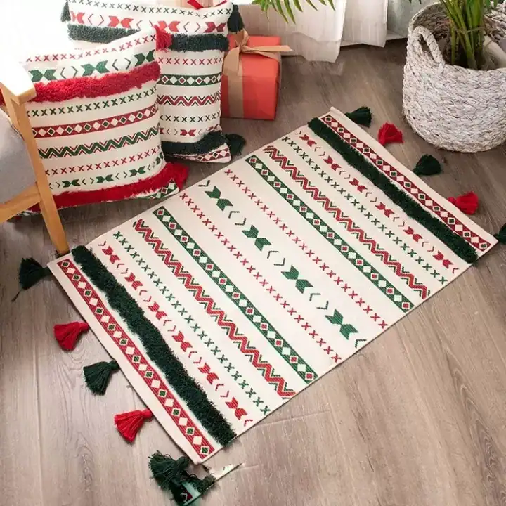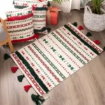 تأتي الدعاسة بألوان نابضة مثل الأحمر والأخضر والأسود على خلفية قماشية فاتحة، وتزينها شرّابات جانبية تزيد من شخصيتها البوهيمية الفريدة. تعد قطعة عملية وتزيينية في آنٍ واحد ضمن فئة دعاسات باب البيت وسجاد مودرن.