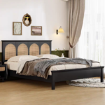 سرير نوم فاخر بطراز فرنسي كلاسيكي يجمع بين جمال الخشب الطبيعي ولمسات الراتان الأنيقة، مصمم ليضفي لمسة من الفخامة والرقي على غرفة النوم.