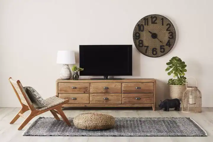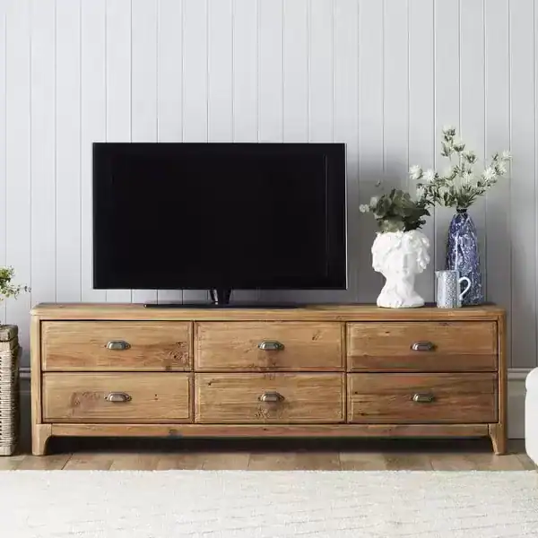 تُبرز هذه الطاولة الخشبية للتلفزيون جمالية الخطوط البسيطة والخامات الطبيعية. الأدراج الستة توفّر مساحة مثالية لتخزين أجهزة التحكم، الكابلات، الأقراص، أو حتى الكتب والديكور الصغير. تصميمها الطويل والمنخفض يجعلها مهيأة لاستيعاب الشاشات الكبيرة بأمان واستقرار.
