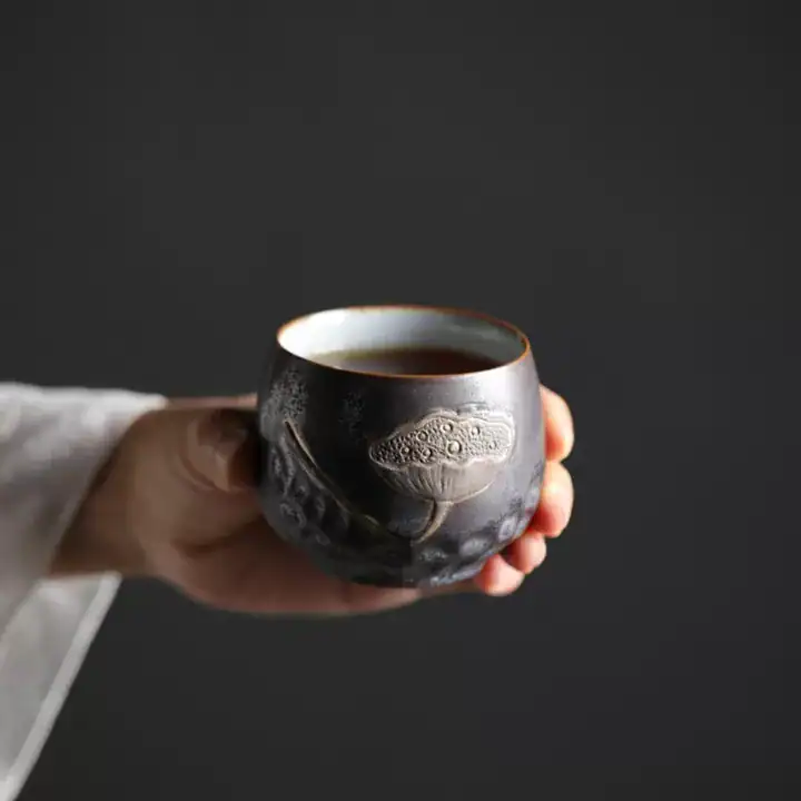 نحت بارز (3D Relief): أهم ما يميز هذه الأكواب هو التصميم الفني المنحوت على جانبها، والذي يجسد ورقة لوتس أو نبات مائي بشكل بارز وملموس، مما يمنح الكوب شخصية فريدة وملمساً غنياً تحت أصابعك.
