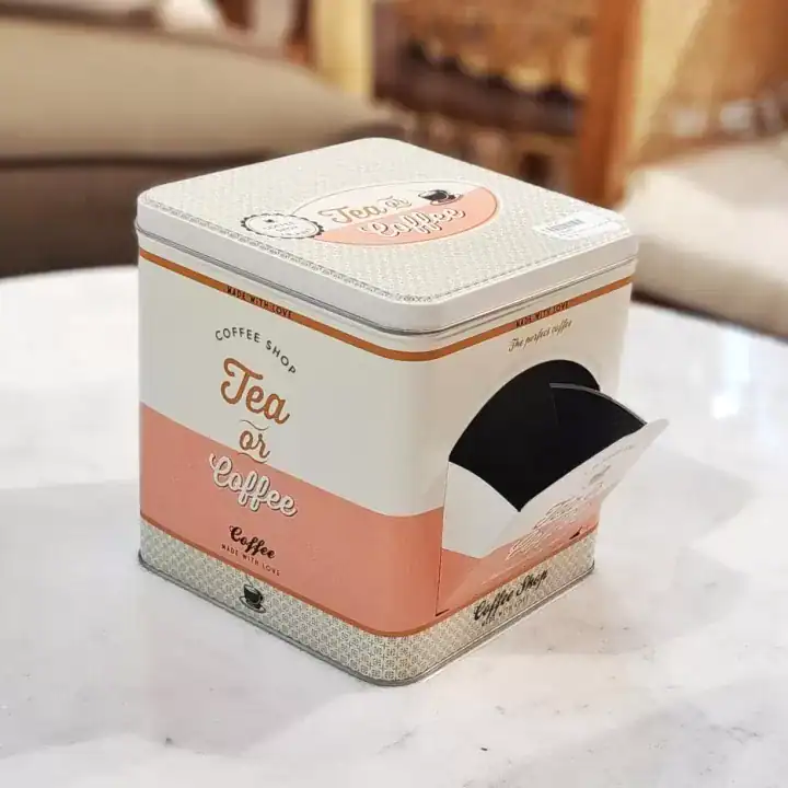تمتاز العلبة المعدنية بغطاء محكم لحماية المحتويات من الرطوبة، وفتحة جانبية لتوزيع الأكياس أو المكونات بسهولة. إنها الخيار الأمثل لكل من يبحث عن حافظة قهوة أو علبة تخزين قهوة تحفظ الطعم والرائحة وتضيف ترتيبًا بصريًا جميلًا.