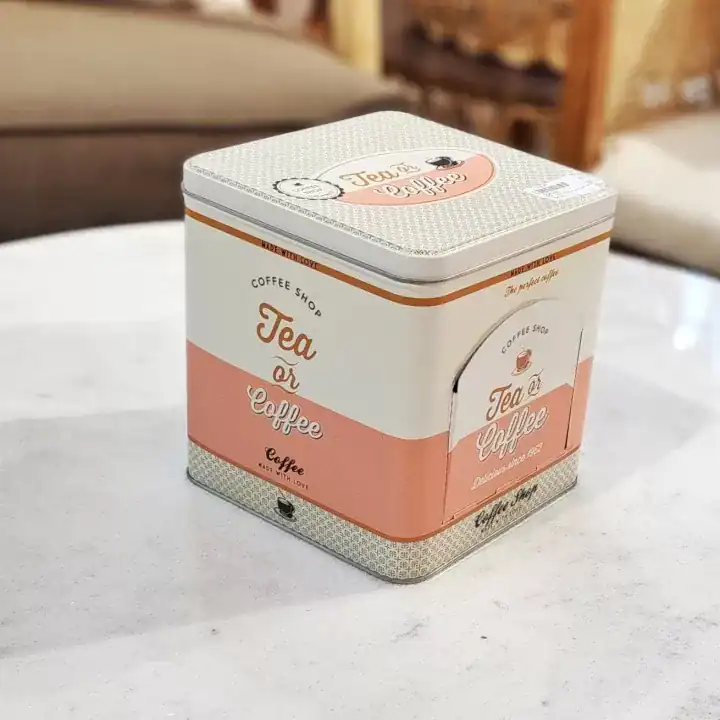 تمتاز العلبة المعدنية بغطاء محكم لحماية المحتويات من الرطوبة، وفتحة جانبية لتوزيع الأكياس أو المكونات بسهولة. إنها الخيار الأمثل لكل من يبحث عن حافظة قهوة أو علبة تخزين قهوة تحفظ الطعم والرائحة وتضيف ترتيبًا بصريًا جميلًا.