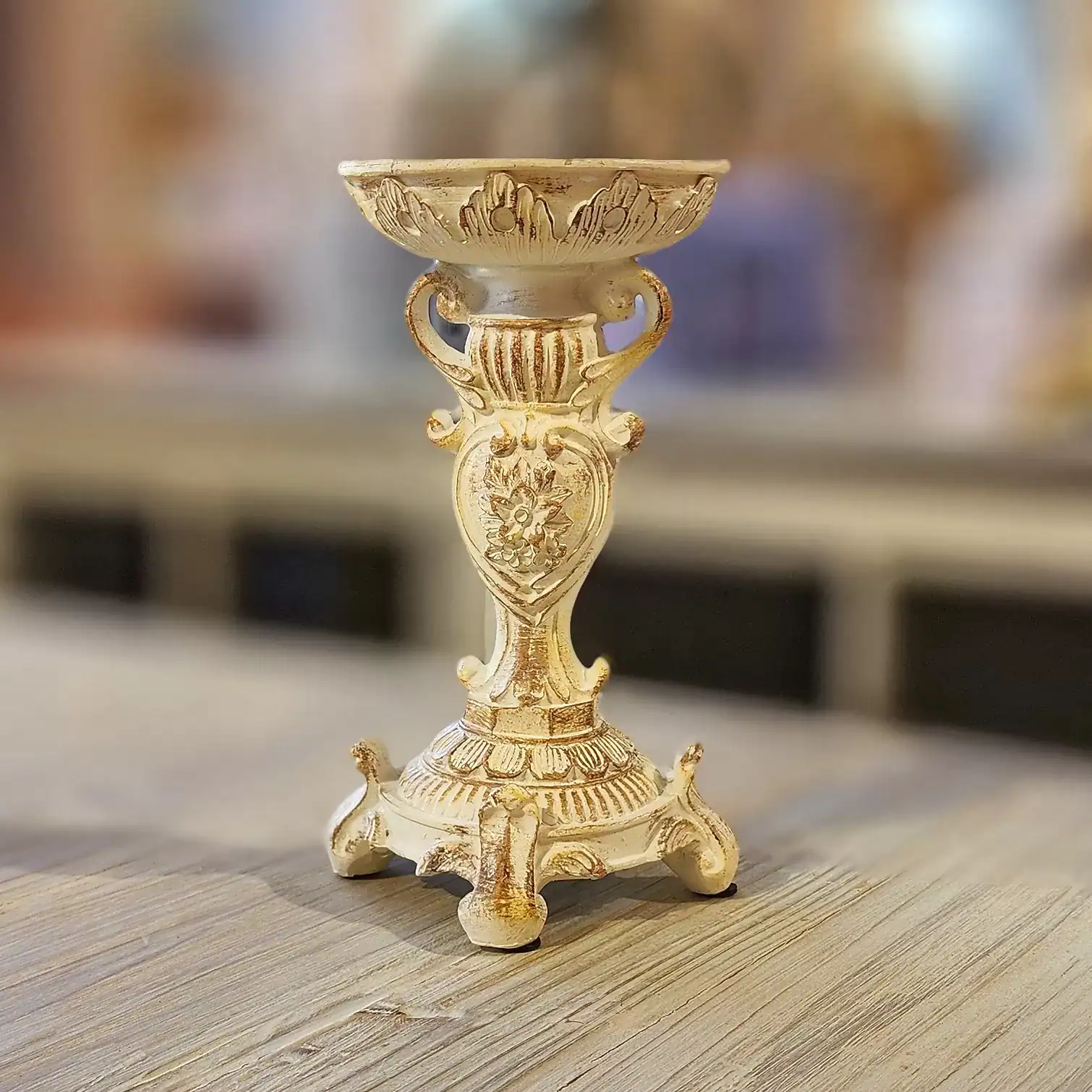 حامل شموع ذهبي بتصميم فكتوري – لمسة كلاسيكية تليق بالمجالس الراقية أضف طابعًا فنيًا فخمًا إلى ديكور منزلك مع حامل الشموع الذهبي المصنوع من السيراميك الصناعي، والمصمم بأسلوب فكتوري كلاسيكي مستوحى من زخارف القصور الأوروبية القديمة. بتفاصيله الراقية وحجمه العملي، يعد هذا الحامل قطعة ديكور مثالية تضيف إشراقًا ملكيًا إلى أي مساحة.