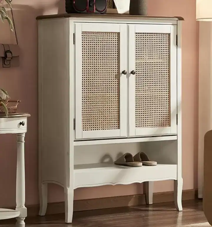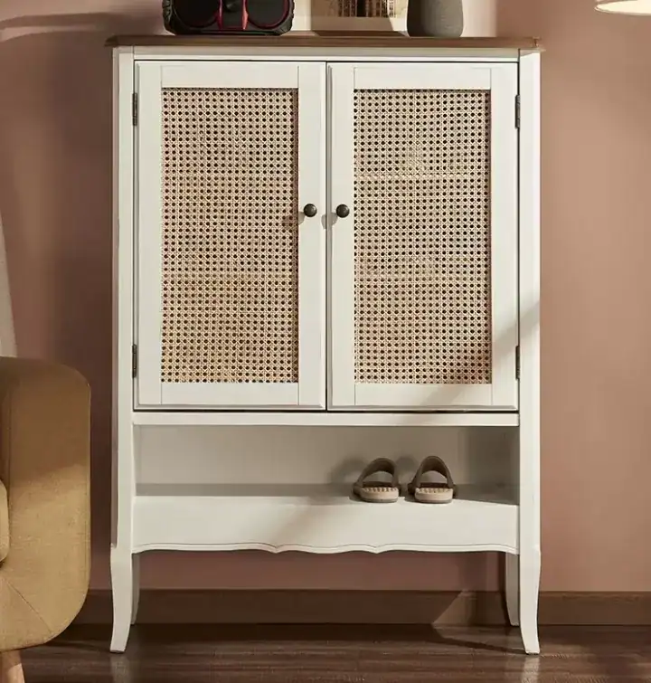 • دولاب أحذية خشبي أبواب الرتان بها فتحات تسمح بمرور الهواء لمنع تراكم الروائح والحفاظ على الأحذية.