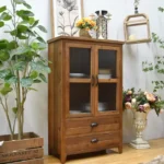 دولاب خشب صنوبر طبيعي بأبواب زجاجية ودرجين للتخزين