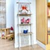 رف جداري بثلاثة أرفف من الخشب الطبيعي وخيوط المكرمية لعرض المنتجات أو النباتات، تصميم أنيق ومناسب للديكور المنزلي أو التجاري.
