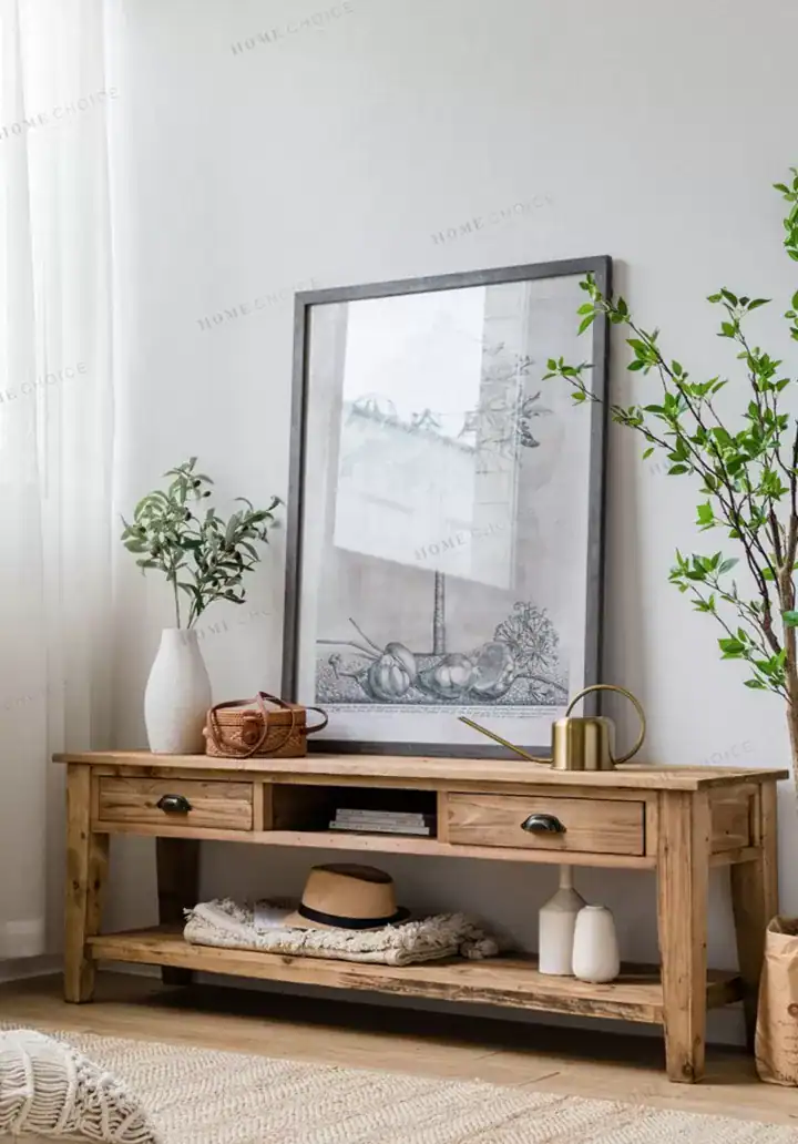 طاولة تلفزيون خشبي بتصميم ريفي أنيق تضيف دفئاً وأناقة عملية لغرفة المعيشة.