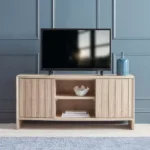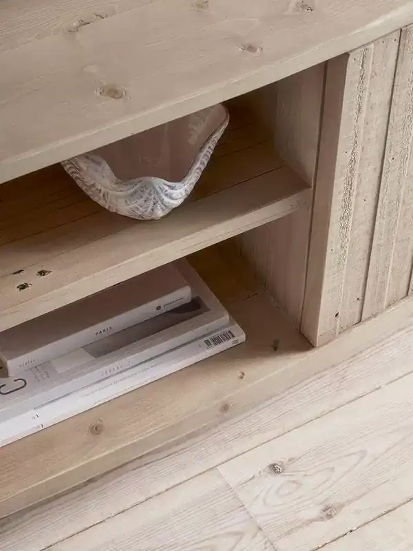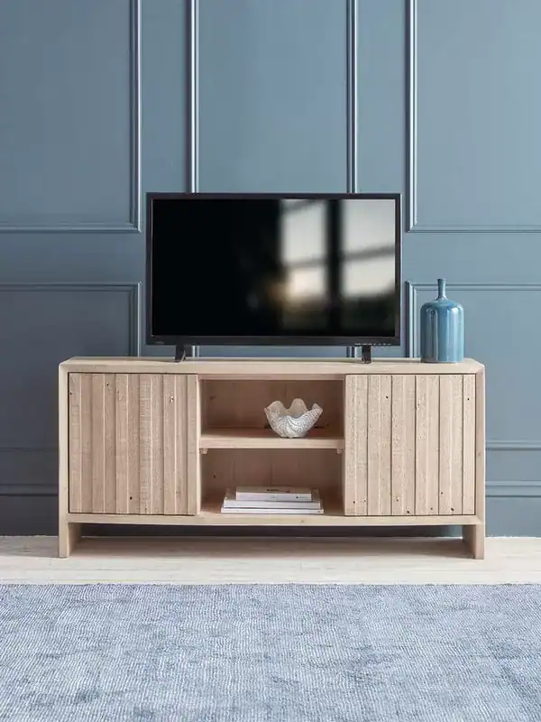 طاولة تلفزيون ريفي بتصميم أنيق مصنوعة من خشب الصنوبر الطبيعي تضيف دفئاً ولمسة طبيعية لغرفة المعيشة.