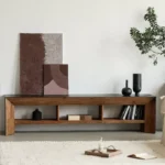 طاولة تلفزيون خشب طبيعي توفر مساحة تخزين واسعة مع رفوف مفتوحة لترتيب الأجهزة الإلكترونية والكتب والديكورات.