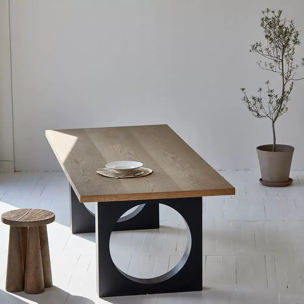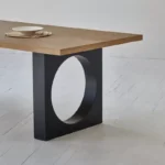 القاعدة المعمارية (Architectural Base): تبتعد عن الأرجل التقليدية لترتكز على هيكل أسود بتصميم دائري هندسي مبتكر، يمنح الطاولة ثباتاً عالياً ومظهراً عصرياً يشبه المنحوتات الفنية، مما يخلق تبايناً مذهلاً مع السطح الخشبي.