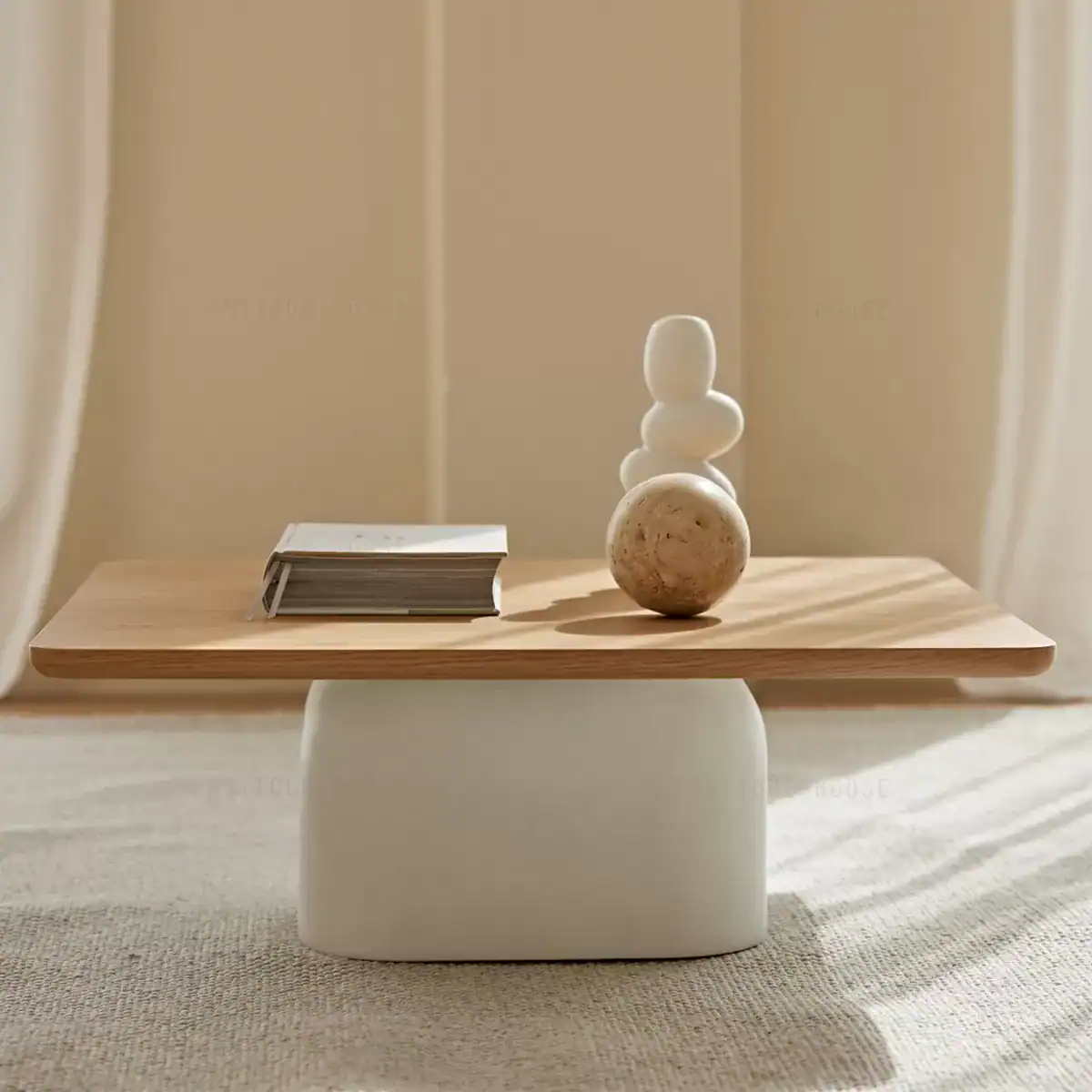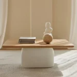 تجمع الطاولة القهوة المربعة بين الأسلوب العصري والراحة البصرية من خلال تناغم اللونين الخشبي الفاتح والأبيض المطفي. السطح الخشبي يعكس العروق الطبيعية للأوك ويمنح شعورًا بالدفء، في حين أن القاعدة البيضاء المنحنية تضفي لمسة خفيفة ومثالية للمساحات الهادئة والمريحة.