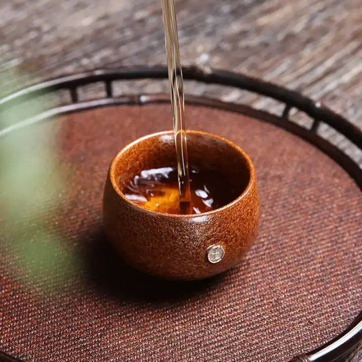 تصميم ياباني “وابي سابي”: الملمس غير المنتظم والطلاء الذي يشبه “الصدأ الفني” (Rust Glaze) يعطي الأكواب طابعاً تراثياً عريقاً، بينما يضيف الختم الفضي لمسة مودرن فاخرة.