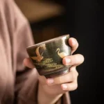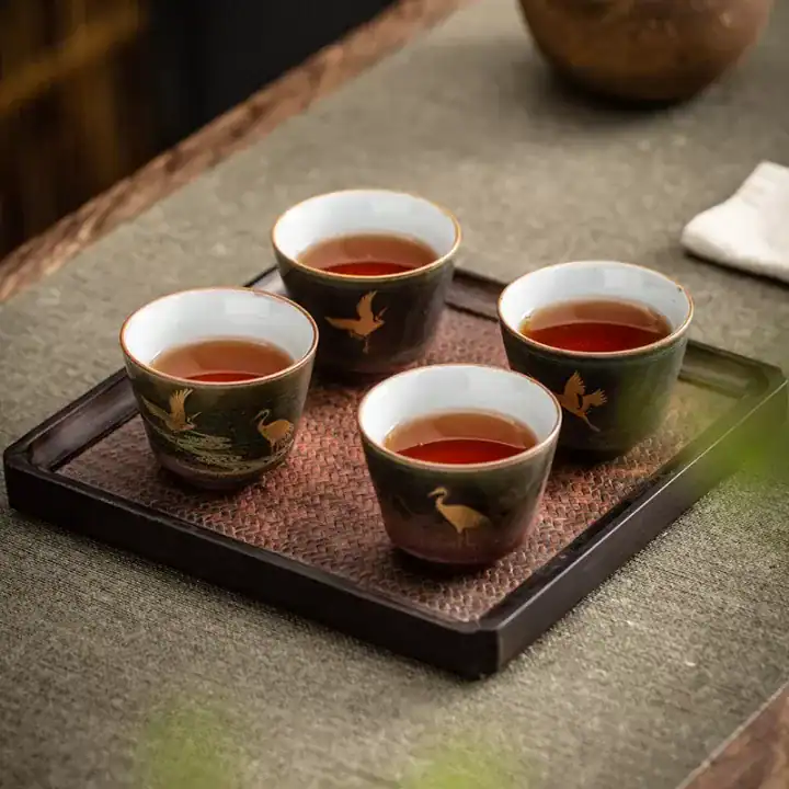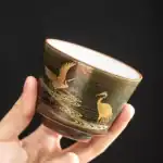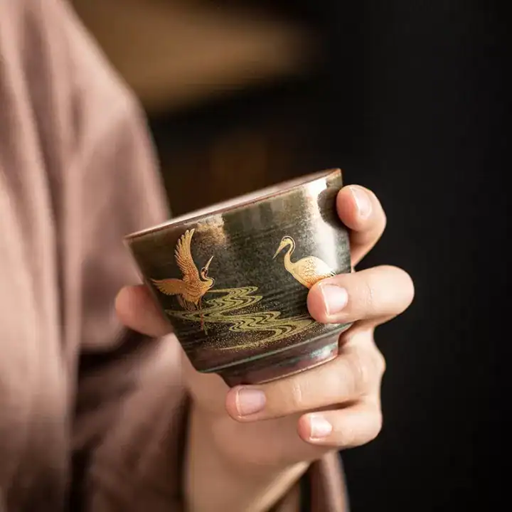 رسم طائر الكركي الذهبي (Golden Crane): تتزين الأكواب برسم دقيق ومتقن لطائر الكركي وهو يحلق، مرسوماً بماء الذهب ليعكس الضوء ويضفي طابعاً ملكياً وفخماً على مائدتك، حيث يرمز هذا الطائر في الثقافة الآسيوية للرفعة وطول العمر.