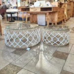 طقم طاولات خدمة أبيض يعكس التوازن بين الجمال العملي والتصميم الفني. القاعدة المصنوعة يدويًا من المكرمية البيضاء تضيف بُعدًا بصريًا مميزًا، بينما يعكس السطح الزجاجي النقي الإضاءة ويمنح المكان اتساعًا وأناقة. مثالي كـ طقم طاولة قهوة في المجالس أو كـ طقم طاولات خدمة في زوايا الاستقبال.