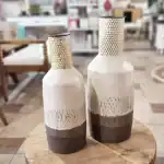 أضف لمسة فنية مبهرة إلى ديكور منزلك مع هذه الفازات الكبيرة بتصميمها العصري الفريد. مصنوعة من المعدن الفاخر بتدرجات ألوان ناعمة تبدأ من الكريمي وتنتهي بالبني الغامق، مع تفاصيل زخرفية على عنق الفازة تشبه خلايا النحل المعدنية، تمنحها ملمسًا بصريًا فاخرًا.