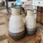 أضف حضورًا مميزًا لمساحاتك مع هذه الفازات المعدنية المصممة بتدرجات لونية ترابية وملمس فني يجمع بين الطابع الصناعي واللمسة الريفية الراقية. تصميمها الأسطواني العريض والمقابض الجانبية يمنحها طابعًا مميزًا يجعلها من أفضل فازات الديكور للمداخل أو الزوايا المفتوحة.