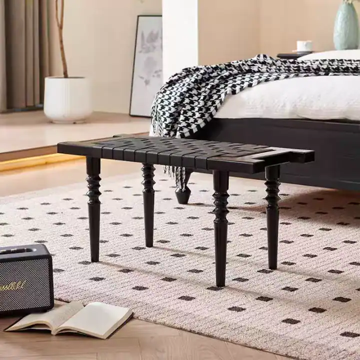 تميّز بقطعة ديكور عملية وأنيقة مع كرسي بانش صغير مصنوع من خشب أوك أمريكي طبيعي، ومغطى بالكامل بجلد أسود ناعم عالي الجودة. تصميمه المربع المتشابك يجعل منه إضافة راقية عند أطراف السرير أو ضمن ركن جلوس عصري.