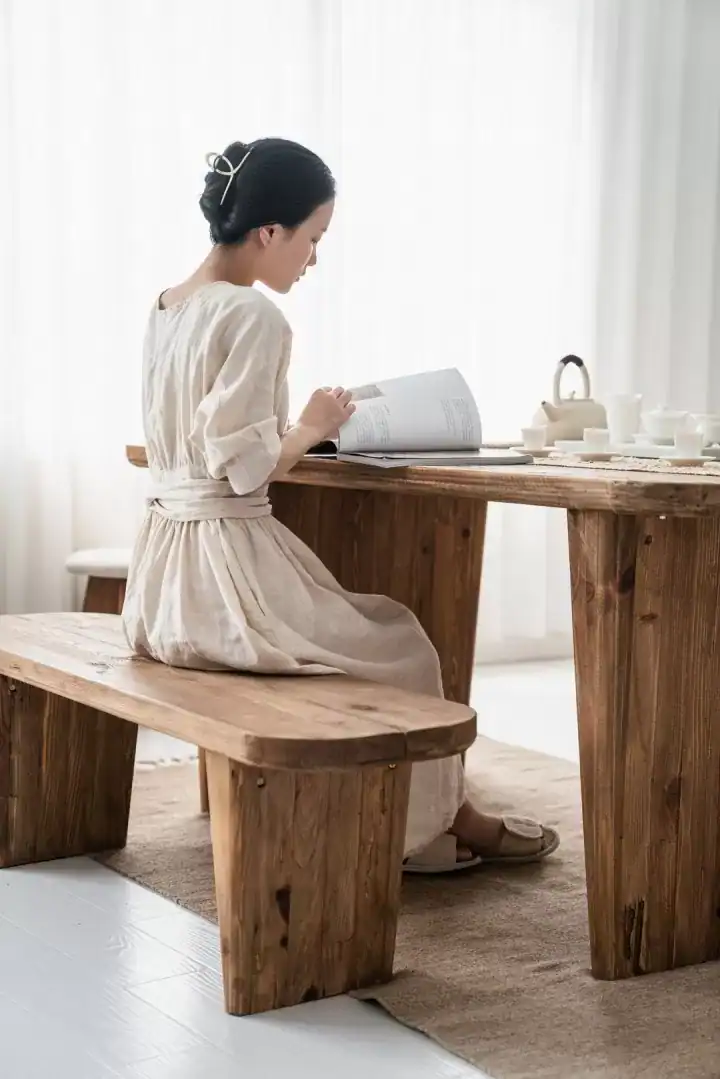 يتميز كرسي البنش الطويل بتصميمه الانسيابي والبسيط، مما يجعله مثاليًا لاستخدامه كمقعد لطاولة طعام، أو مقعد إضافي في المدخل، أو حتى قطعة ديكور عملية قرب النوافذ. يُبرز الخشب المستخدم تفاصيل الطبيعة من عقد وألياف تضفي طابعًا فنيًا أصيلًا على القطعة.