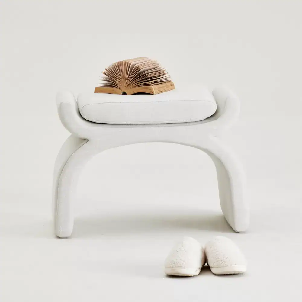 كرسي تسريحة ملبّس بالقماش الأبيض بتصميم ناعم وانسيابي