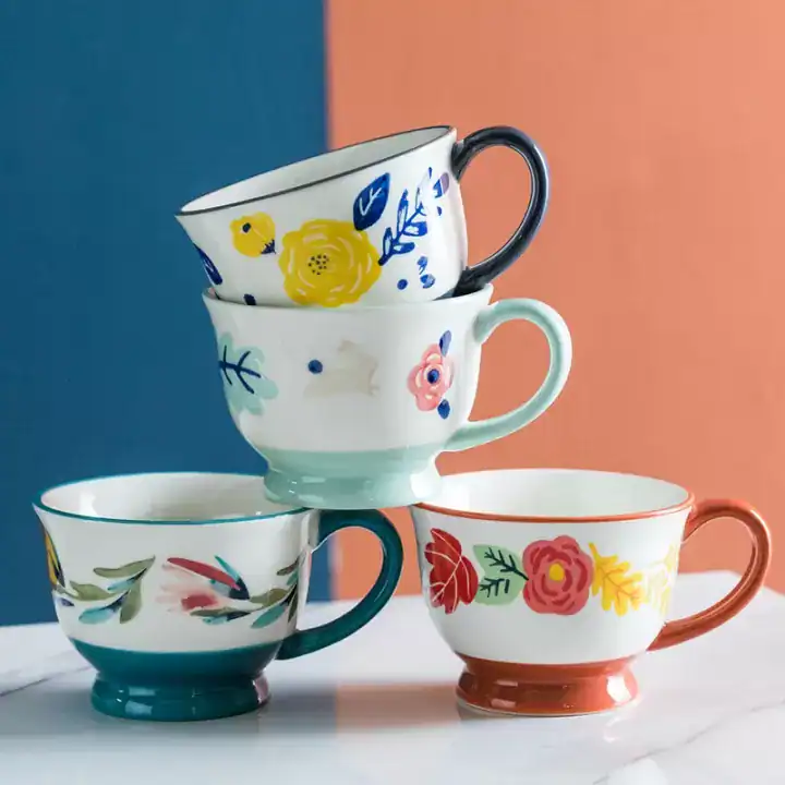 تفاصيل ملونة: كل كوب يأتي بحافة علوية ومقبض وكعب سفلي ملون بلون يتماشى مع الرسمة (أزرق، أخضر، أو بني)، مما يخلق إطاراً جميلاً للرسمة.