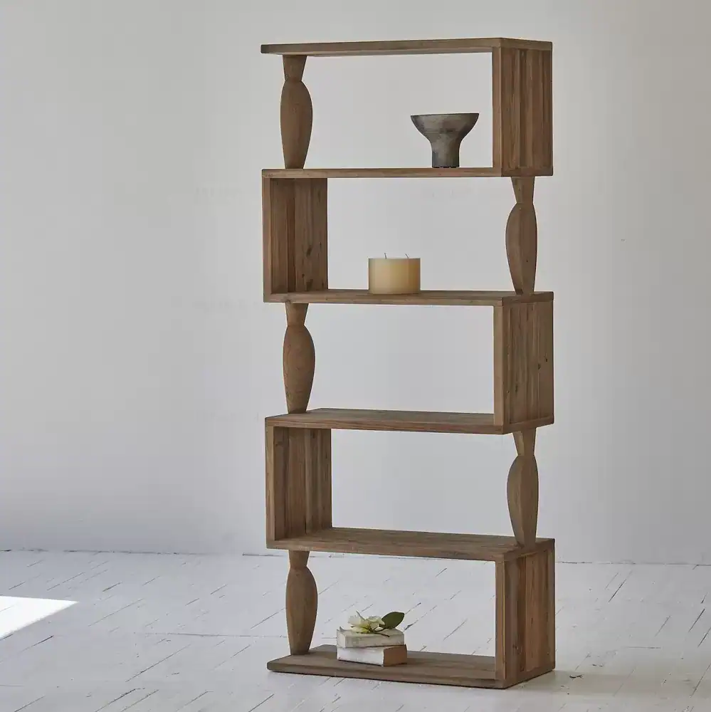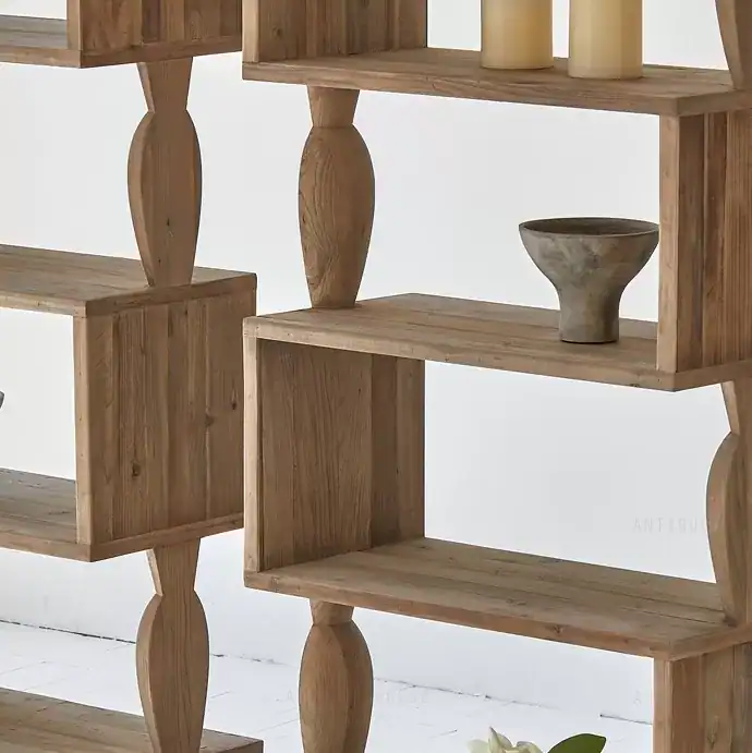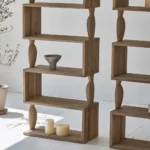 الأعمدة المنحوتة (Sculptural Columns): لا تعتمد على الجوانب التقليدية المصمتة، بل ترتكز الرفوف على أعمدة خشبية منحوتة بشكل فني جذاب، مما يخلق فراغات بصرية تجعل المكتبة تبدو خفيفة وأنيقة.