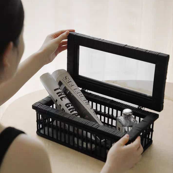 تصميم معماري (Architectural Look): شكل الأعواد العمودية يعطي الصندوق هيكلاً هندسياً جميلاً. إنه يبدو رائعاً سواء كان مفتوحاً أو مغلقاً، ويعتبر قطعة فنية بحد ذاته على طاولة الكونسول أو التسريحة.