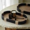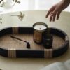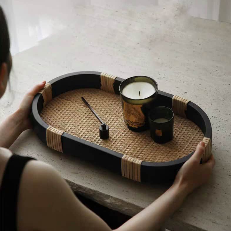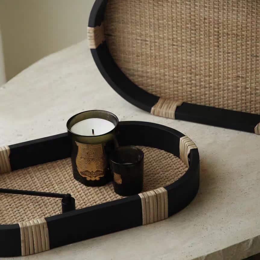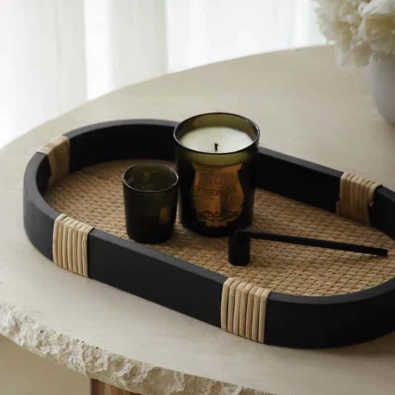 تفاصيل جانبية ملفوفة: مقابض أو جوانب الصينية مزينة بلفائف من الخيزران الطبيعي الفاتح (Rattan Wrapping)، مما يضيف لمسة حرفية دقيقة تكسر حدة اللون الأسود.