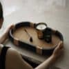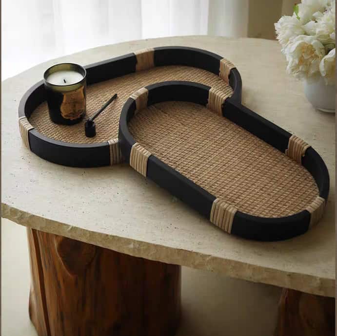 إذا كنتِ تبحثين عن قطعة تربط بين الأثاث الحديث والديكور الطبيعي، فإن صينية الخشب الأسود والراتان هي الحلقة المفقودة. هذا المزيج بين “الأسود الجريء” و”البيج الطبيعي” يعتبر من أقوى صيحات الديكور العالمية (Modern Organic Style).