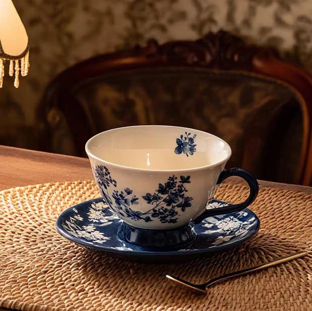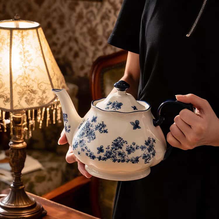 نقوش زهور زرقاء: يزدان الإبريق والأكواب برسومات زهور زرقاء دقيقة ومنتشرة بنعومة، تحاكي الخزف الإنجليزي والصيني القديم.
