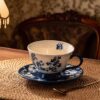 صحون مميزة: الصحون (Saucers) تأتي بلون أزرق كامل مزين بنقوش بيضاء، مما يخلق قاعدة داكنة تبرز جمال الكوب الفاتح فوقها.