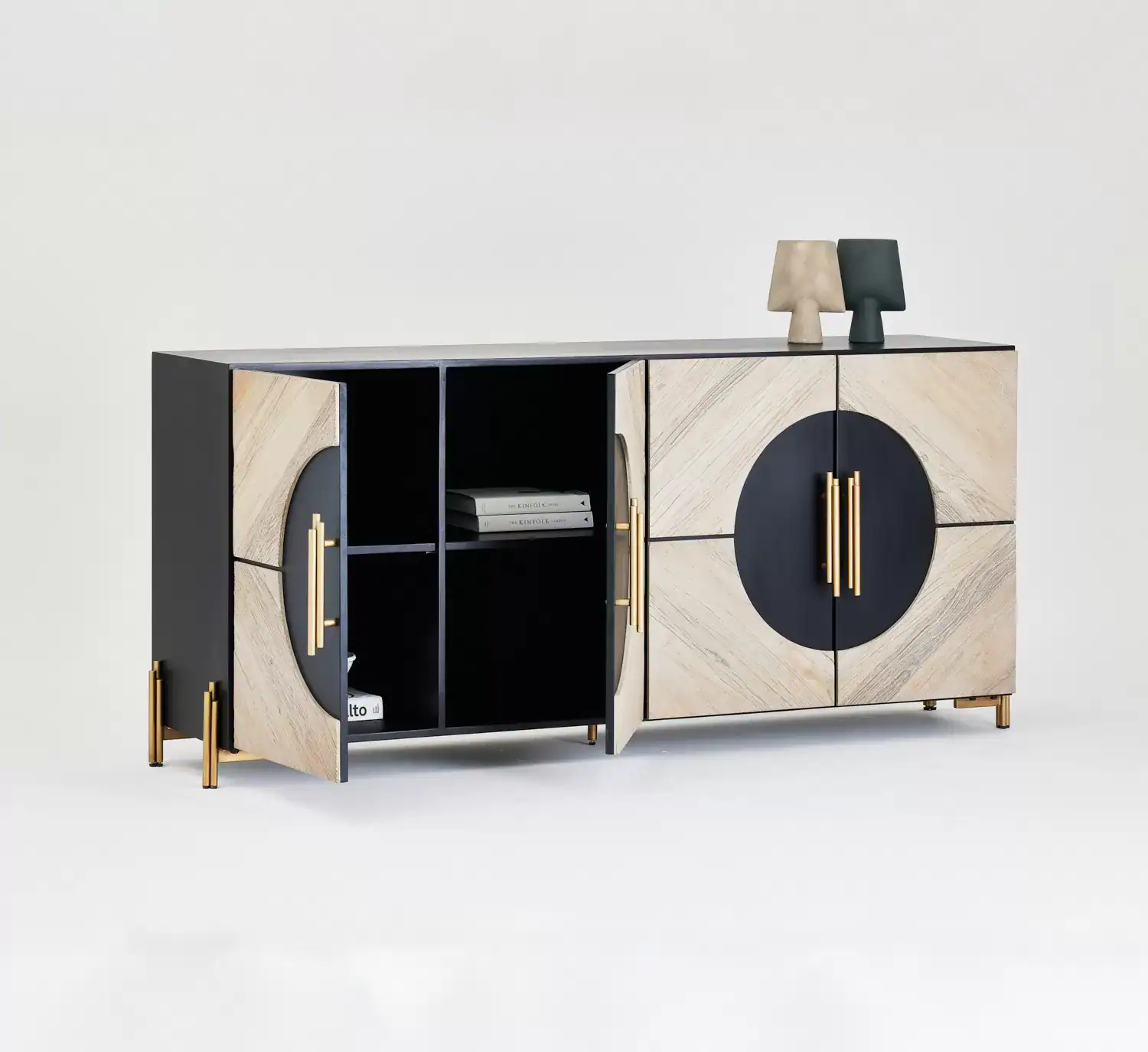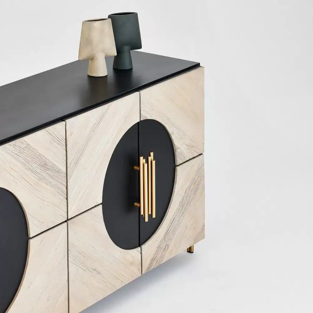التصميم الفني: واجهة مميزة تجمع بين الدوائر السوداء البارزة والخشب الطبيعي، تتوسطها مقابض ذهبية لامعة تعكس الذوق الرفيع والحداثة (Art Deco Touch).