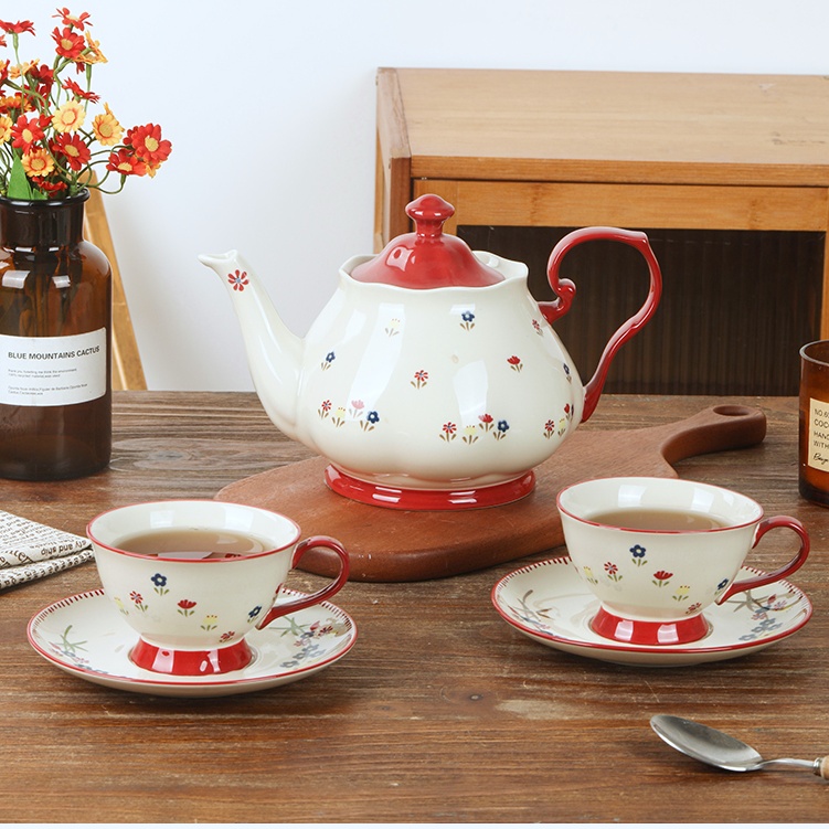 تصميم كلاسيكي (Vintage Floral): يتميز الطقم بلون كريمي هادئ مزين بنقوش زهور برية صغيرة (زرقاء، صفراء، حمراء)، مع غطاء ومقابض وقواعد باللون الأحمر القاني، مما يخلق تباينًا لونيًا جذابًا وأنيقًا.
