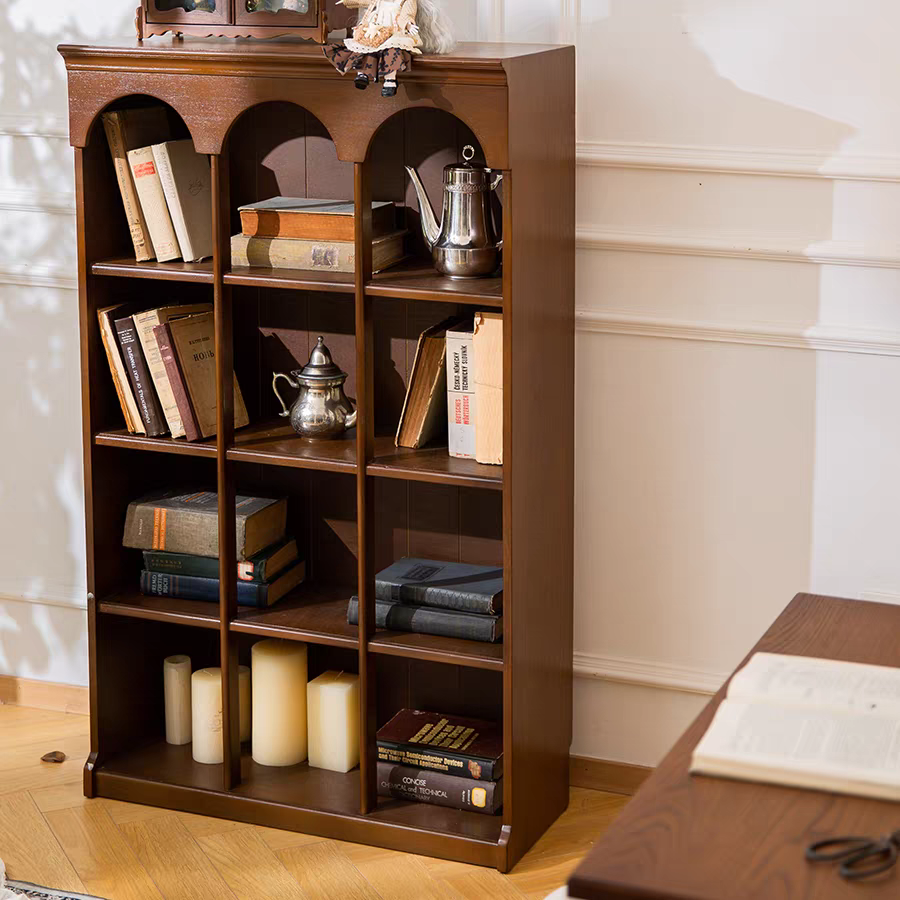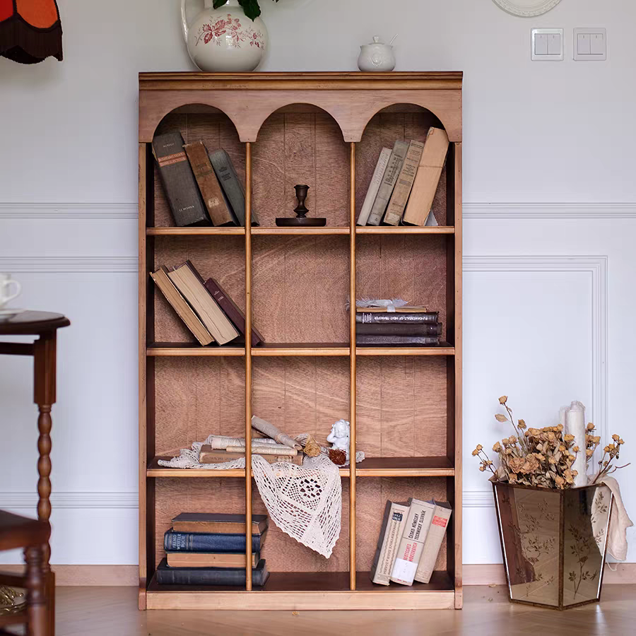 تصميم الأقواس الفرنسية: تتميز المكتبة بصف علوي مزين بثلاثة أقواس خشبية منحوتة (Arched Tops)، مما يضفي عليها لمسة رومانسية مستوحاة من العمارة الأوروبية القديمة.