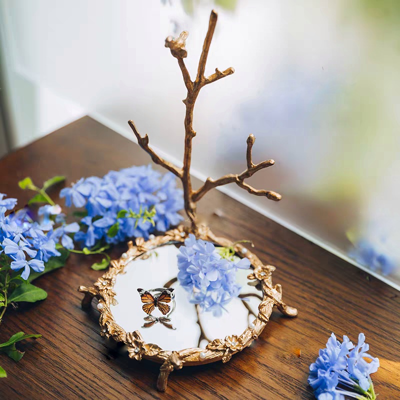 ستاند عرض مجوهرات واكسسوارات ذهبي بتصميم غصن وقاعدة مرايا لتنظيم الخواتم والسلاسل