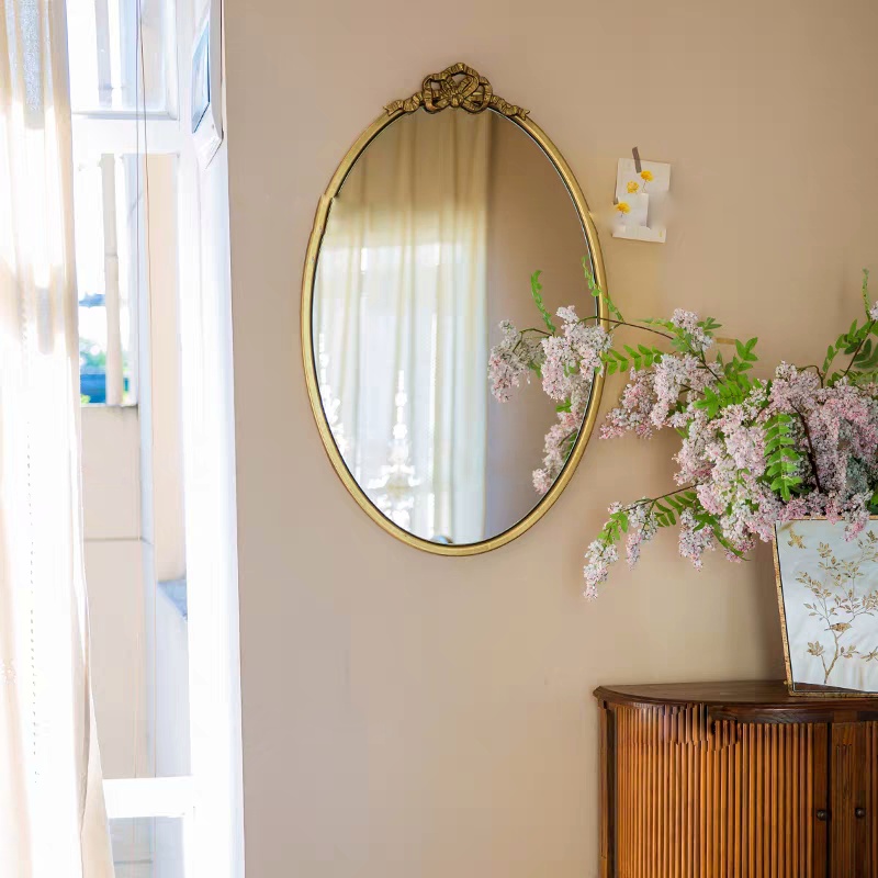 هل تبحثين عن قطعة ديكور تخطف الأنظار بنعومتها؟ المرآة البيضاوية الذهبية مع تفصيل الفيونكة هي الخيار الأمثل. هذا التصميم المستوحى من الطراز الفرنسي القديم يعيد إحياء سحر الماضي في منزلك، ويحول أي جدار عادي إلى لوحة فنية راقية.