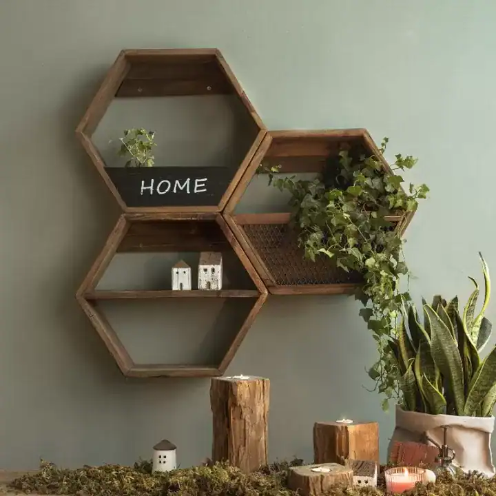 الشكل الهندسي: تصميم سداسي (Hexagon) يحاكي خلية النحل، وهو أحدث صيحات الديكور للجدران (Geometric Wall Art).