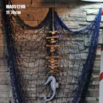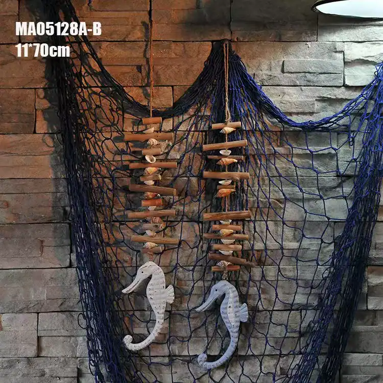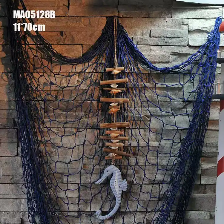 تصميم بحري متكامل: تأتي المنحوتة مثبتة على شبكة صيد زرقاء كبيرة محملة بقطع خشبية وصدف طبيعي، مما يخلق مشهداً بحرياً حياً.