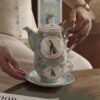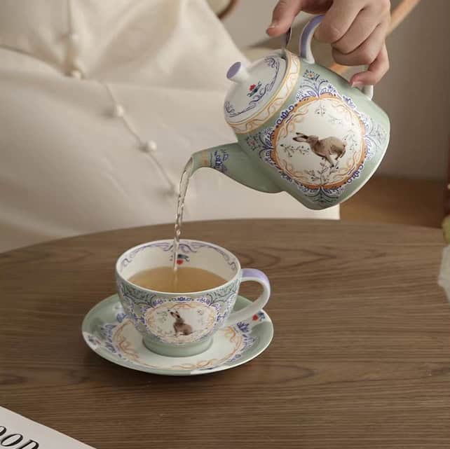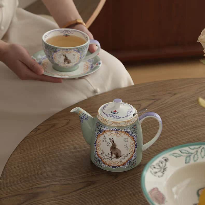 لوحة فنية تراثية: على عكس التصاميم الكرتونية، تأتي رسمة الأرنب هنا بأسلوب واقعي وكلاسيكي (Vintage Illustration)، مما يجعل الطقم قطعة فنية تليق بالضيوف المميزين والمناسبات الرسمية.