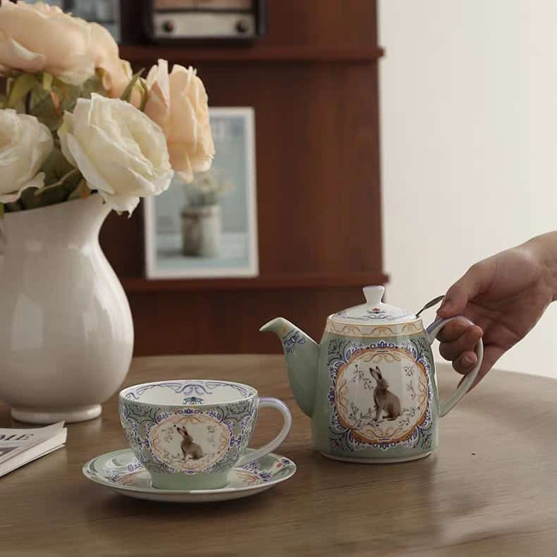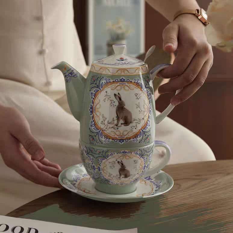 تصميم الأرنب الفيكتوري: تظهر رسمة دقيقة لأرنب بري بني اللون داخل إطار مزخرف باللونين الذهبي والأزرق، مما يعطي الطقم طابعاً أثرياً قيماً يشبه مقتنيات القصور الريفية.