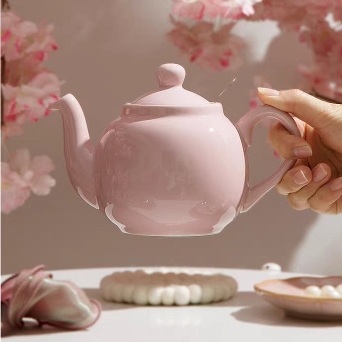 لون وردي باستيل (Baby Pink): يتميز هذا الإبريق بطلاء سيراميك بلون وردي خافت وناعم جداً، يشبه لون بتلات زهور الكرز، مما يضفي جواً من الرومانسية والهدوء على طاولتك.