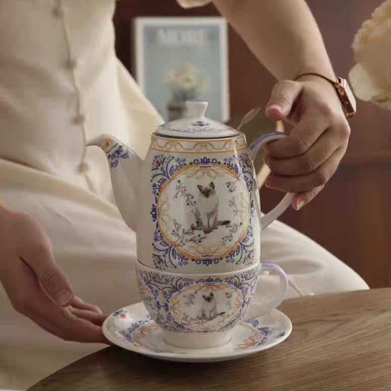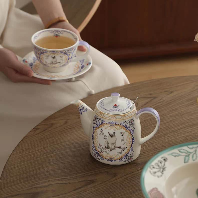 تصميم القطة السيامية: تتوسط الإبريق والأكواب رسمة واقعية لقطة سيامية (Siamese) بوقفتها الأنيقة وألوانها المميزة (البيج والبني الداكن)، مما يضفي لمسة من الفخامة والحياة على الطقم.