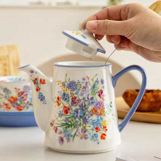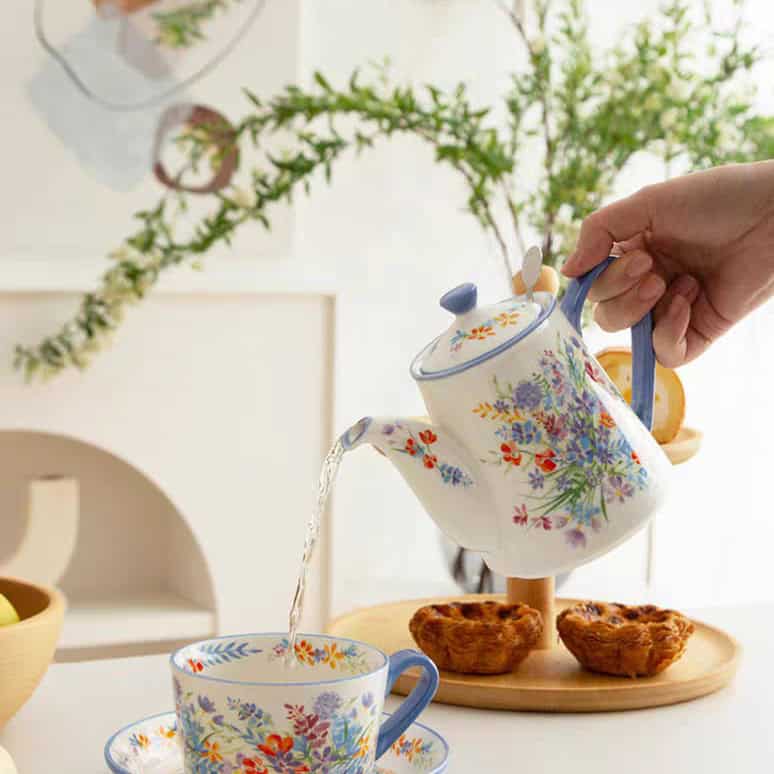جددي مائدتك مع طقم شاي “الزهور البرية” من London Pottery. هذا الطقم يجمع بين عفوية الزهور الصيفية وأناقة اللون الأزرق الهادئ في الصحون والمقابض، ليكون قطعة فنية تخطف الأنظار في كل مرة تقدمين فيها الشاي.