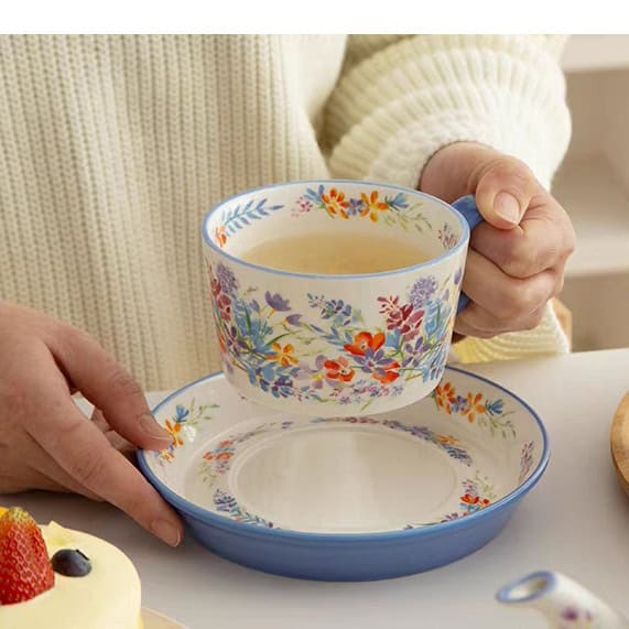 تناغم الألوان: الأزهار الملونة تضفي البهجة، بينما يعمل اللون الأزرق الموحد في الصحن ومقبض الكوب كإطار يبرز جمال هذه الرسومات ويمنح الطقم طابعاً عصرياً (Modern Chic).