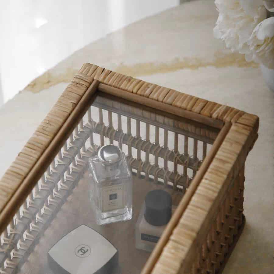 غرفة النوم المشرقة: إذا كان أثاث غرفتك أبيض أو بيج، فهذا الصندوق سيكمل اللوحة بلمسة ناعمة وأنيقة جداً، وسيجعل زجاجات العطور الملونة تبدو كالجواهر بداخله.