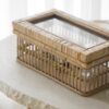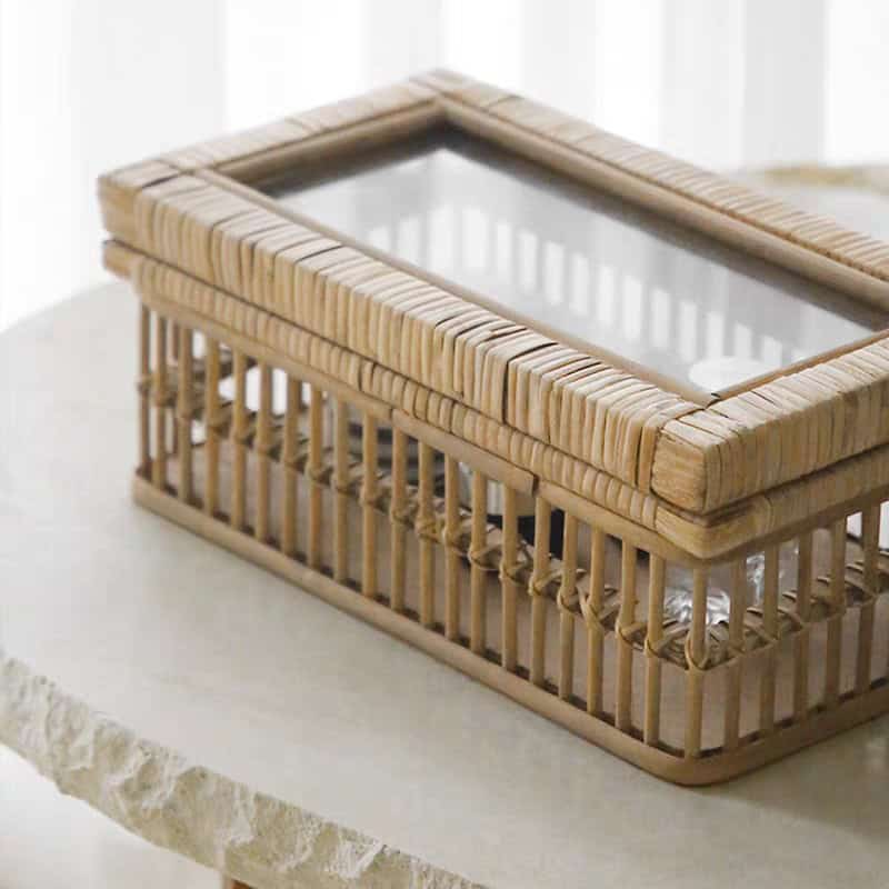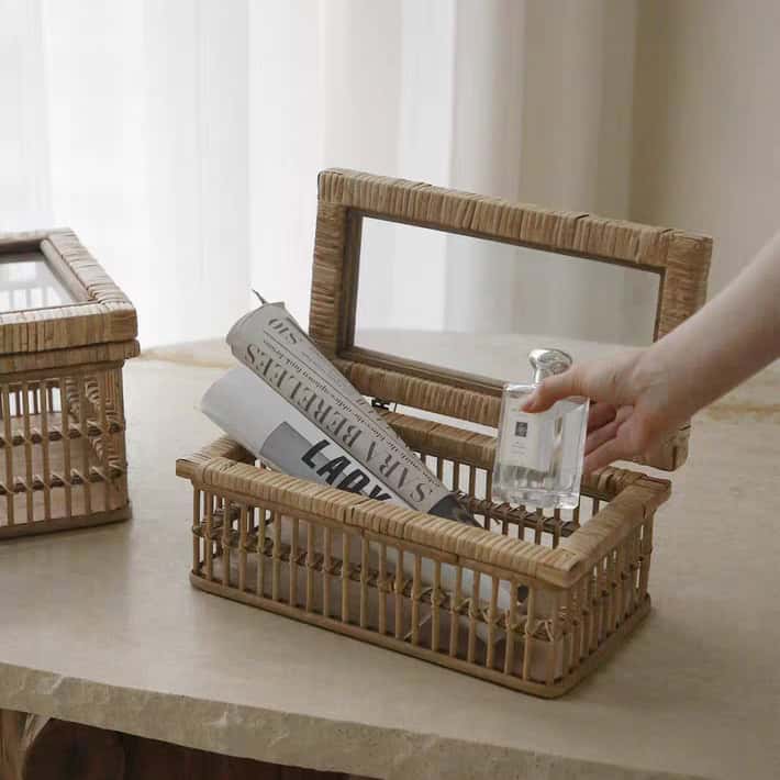 تصميم “القفص” المفتوح: تباعد أعواد الخيزران يسمح برؤية ما بداخل الصندوق جزئياً من الجوانب، مما يعطي مظهراً هوائياً (Airy) وغير مكدس، مثالياً للمساحات التي تحتاج إلى “نفس” بصري.