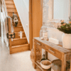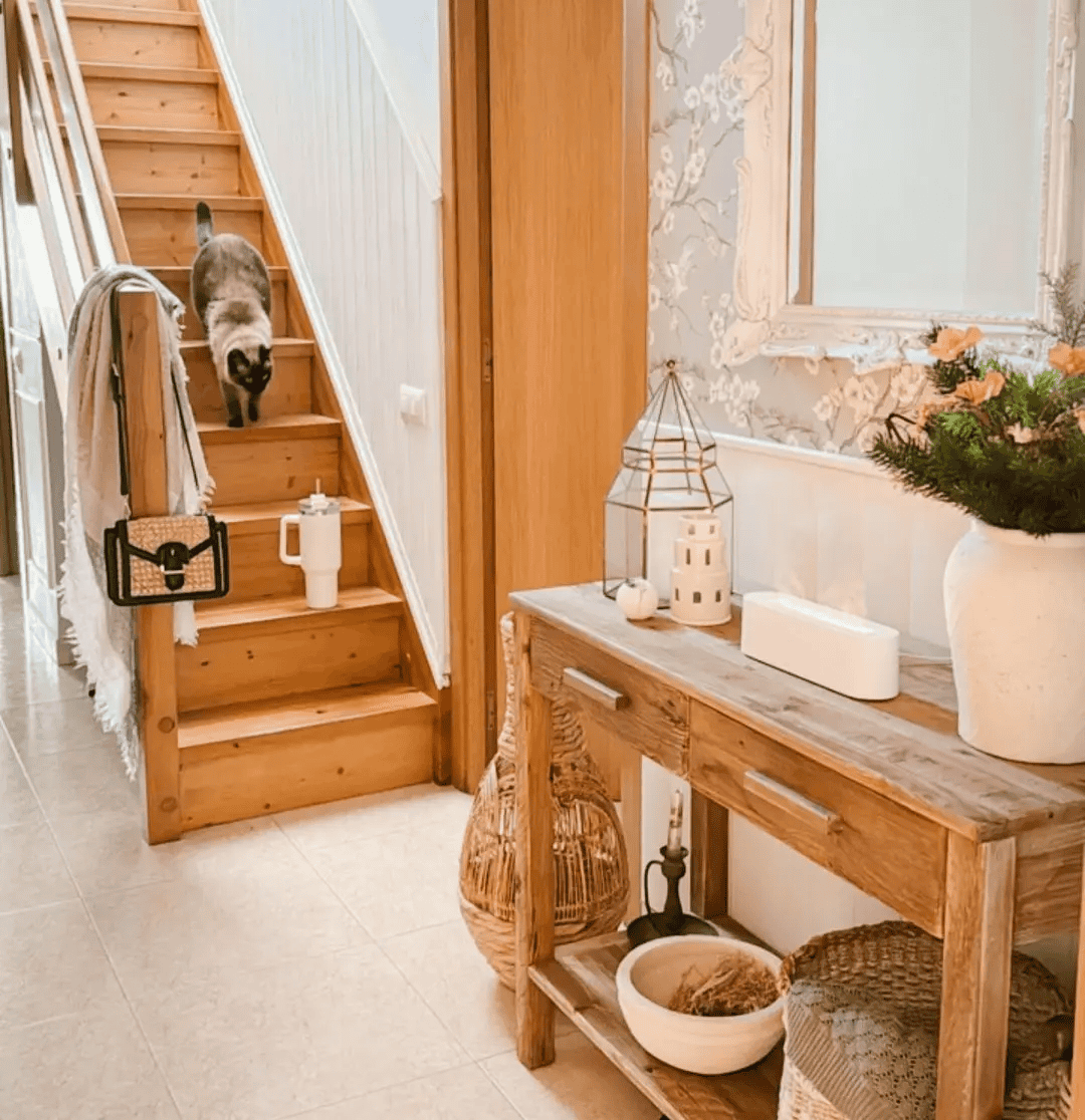 في مدخل المنزل (Entryway): هي المكان المثالي لاستقبال ضيوفك. استخدمي الدرجين لحفظ المفاتيح والبريد، وضعي فازة زهور أنيقة ومرآة دائرية فوق السطح لإعطاء إحساس بالاتساع.